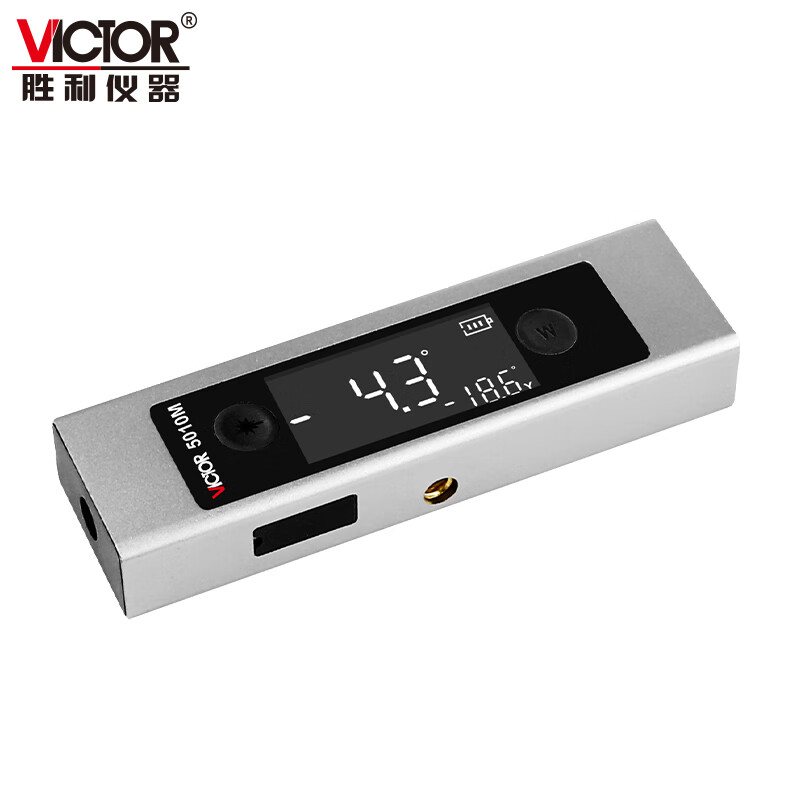 VICTOR 5010M 是一款能实现实时角度测量及激光投线功能二合一的智能角度仪,采用高端进口元件精密组装,可达±0.2°高精度测量,智能与精准兼并。铝合金磨砂机身,呈现利落精工线条,经久耐用;屏幕采用超宽双面LED彩屏,测量秒速反应,数据实时显示;整机轻至约100g,薄约20mm,搭配两个舒适简洁按钮,一手轻松掌控,成就非凡操作体检;内置高容量锂电池高效续航,搭配Type-C充电接口,消灭续航焦虑。集众多优点于一身,满足广泛的应用领域。