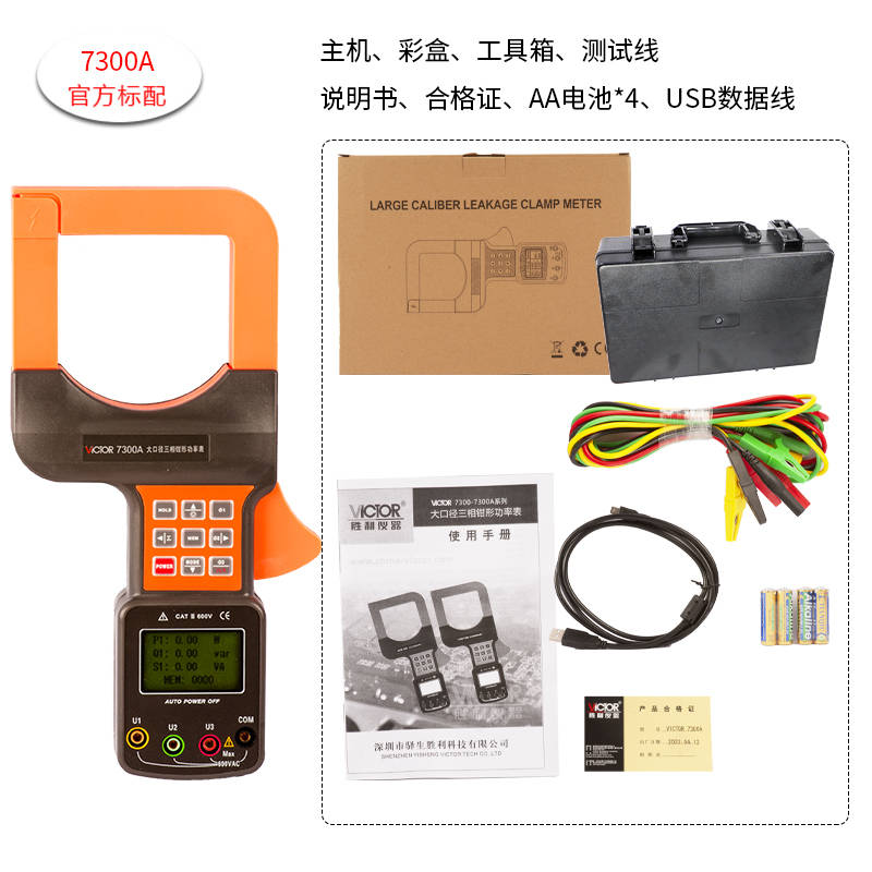 产品型号:VICTOR 7300 7300A 产品名称:大口径三相钳形功率表,功能测量三相交流电压、漏电流、电流、有功功率、无功功率