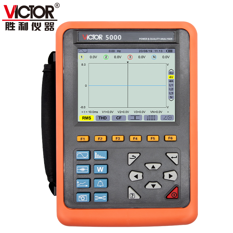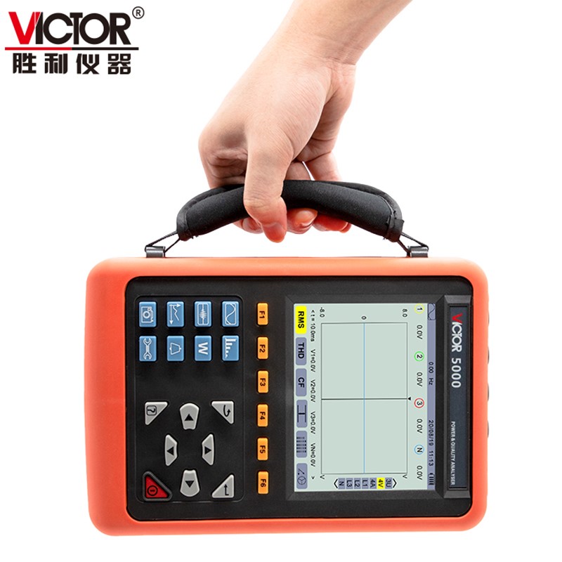 VICTOR5000电能质量分析仪是胜利仪器精心研制的一款专为现场测试的三相、多功能、智能化、人机操作简洁的综合型测试仪器。具有容易使用,超大液晶彩屏显示,高分辨率,中英文双语操作界面,防振结构外壳等特点。可同时测量4路电流(ABC三相及中性线电流),4路电压(ABC三相电压及中性线对地电压)、电流电压的峰值、一段时间内的大小值、三相不平衡度、短时电压闪变、变压器K因数、有功功率、无功功率、视在功率、功率因数、位移功率因数、有功电能、无功电能、视在电能、谐波比、总谐波失真度等;显示电流电压的实时波形、相量图、谐波比柱形图;动态捕捉电压电流瞬时变化,监测启动电流,监测各电力参数并生成告警列表,长时间记录测试数据并生成趋势曲线图等功能。