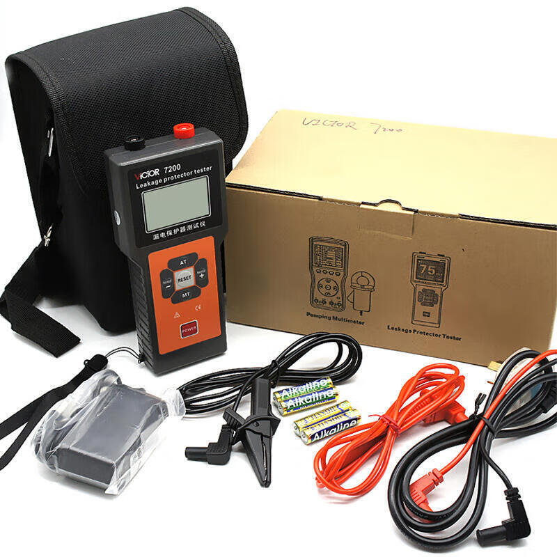 VICTOR 7200漏电保护器测试仪专为现场在线测试各种漏电保护器的漏电动作电流、漏电不动作电流、以及漏电动作时间,测试电流从0~500mA分十档(15、30、50、75、100、150、200、250、300、500mA),测试漏电流动作时间量程为0~999ms,采用128dots×64dotsLCD显示,方便直观。仪表精度高、体积小、重量轻、外观精致,便于携带,是各种漏电保护器现场或室内检测的理想工具。