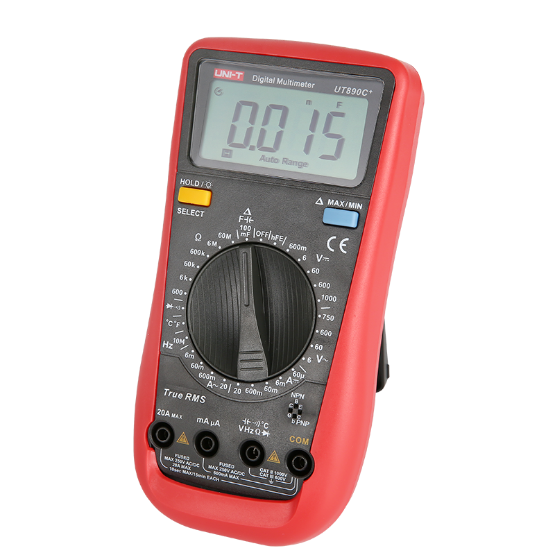 UT890系列全新一代手动量程数字万用表。自动量程100mF大电容档位,可快速测量音响功放,电源板等领域mF等级的大电容。该系列万用表具有真有效值,可准确进行非正常交流信号的有效测量;全量程保护,万用表在电阻档测试时不会由于误操作接入高压而引起烧表。在电子,家电,电器维修工作中,您需要一款耐用、可靠且精确的数字万用表