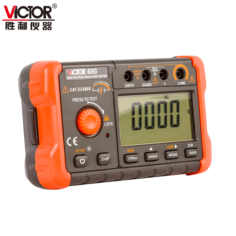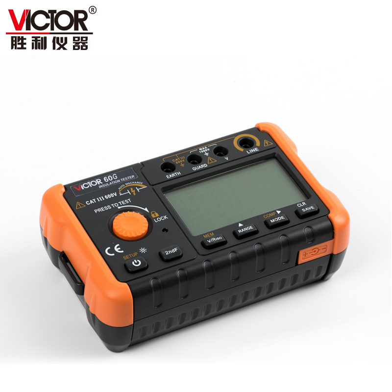 VICTOR 60G 绝缘电阻测试仪是一台智能微型绝缘测试仪器,整机电路设计采用微机技术设计为核心,以大规模集成电路和数字电路相组合,配有强大的测量和数据处理软件,完成绝缘电阻、电压等参数测量,性能稳定,操作简便。对于适用于现场电力设备以及供电线路的测量和检修的用户,本仪器是您的理想的选择。
