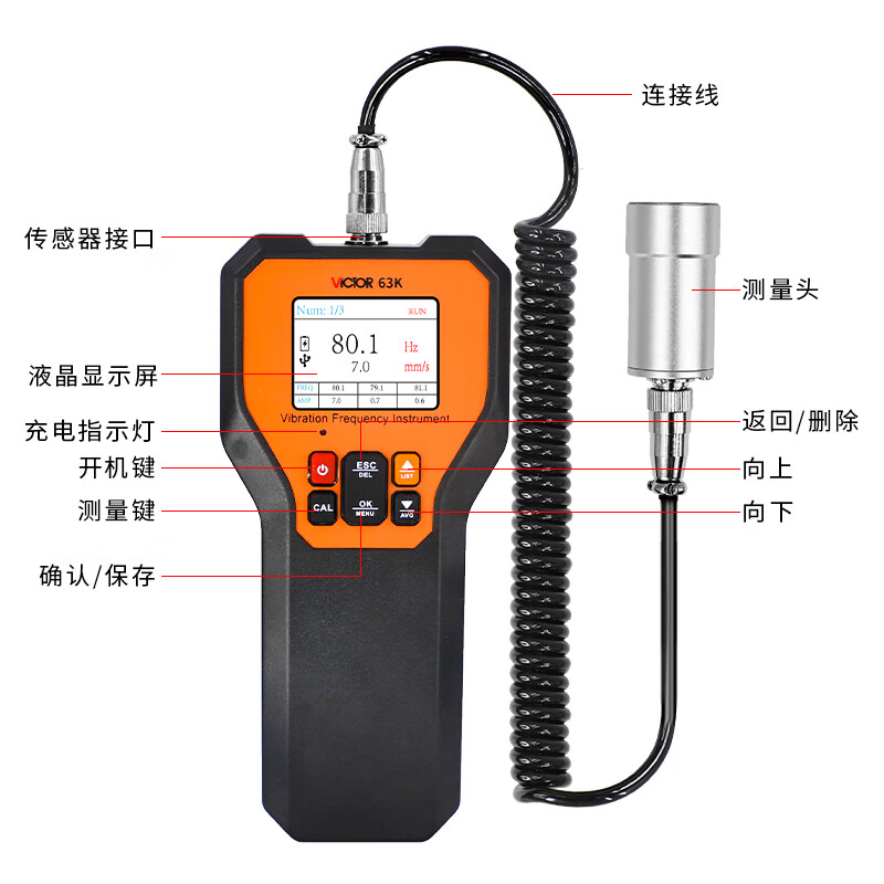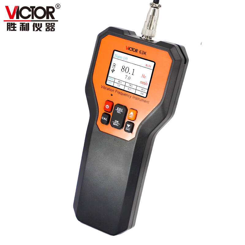 VICTOR 63K振动频率测量仪是针对各种机器设备测量振动频率而研制的,仪表配备加速度传感器,内置频谱分析模块,可对实时的振动数据进行频谱分析,终获得3组大振动频率成分,用户可以根据测量结果再结合被测对象的运行特性对设备进行性能和安全评估。 适用于机械、电力、石化、交通等行业的设备振动检测。